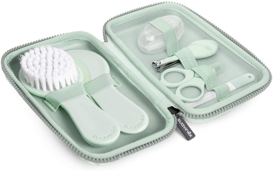 Beauty-case contenente: Spazzola con setole morbide per spazzolare i capelli e massaggiare contemporaneamente. Pettine con dentini arrotondati per scioglierei piccoli nodi. Spazzolino da dito in morbido silicone per pulire delicatamente le gengive e i primi dentini. Con custodia igienica Taglia unghie per tagliare in modo semplice e netto le unghie. Design ergonomico per essere usato facilmente mentre si tiene il bambino in braccio. Forbicine piccole e con la punta arrotondata, specifiche per le unghie dei bebè e custodia proteggi lame. Lima specifica per le unghie sottili e fragili. La delicata limatura aiuta a prevenire che le unghie si sfaldino.